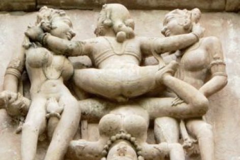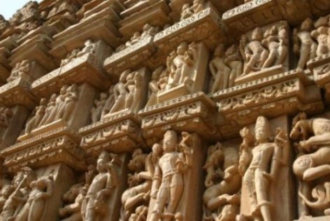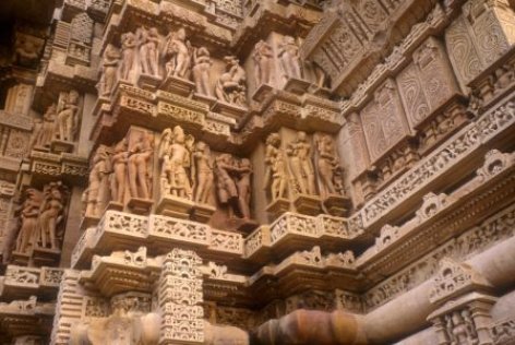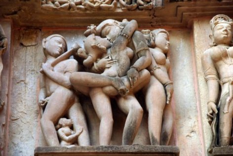 Die Außenwände der Tantra-Tempel sind über und über mit in Stein gehauenen nackten Statuen übersät, die sich hier und da lustvoll vereinigen.